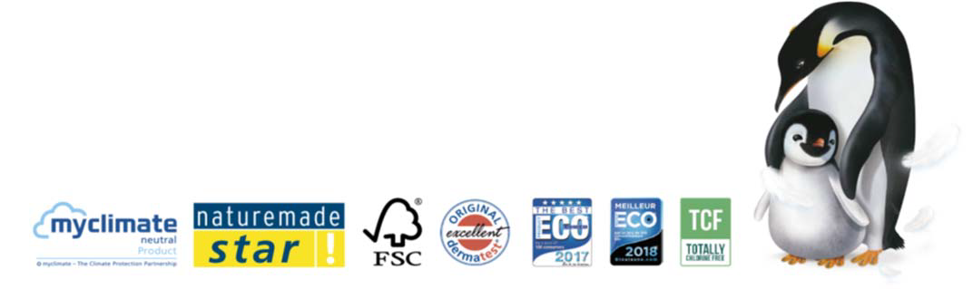 Primer pañal ecológico con 3 certificaciones "FSC", "NaturemadeStar" y "MyClimate"